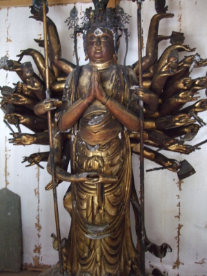 木彫金箔寄木造りで像高173センチメートル、千手千眼自在菩薩ともいわれ、千の慈眼と千の慈手を持って衆生を救済してくださるというありがたい観音で、中央の2手を除いて左右に20手ずつ計40手で25有界の衆生を救うとされ40に25を乗ずれば1000手になるといった42臂の像である。仏師や造像年代は不明であるが、造像技術は優れていて今後の研究課題である。