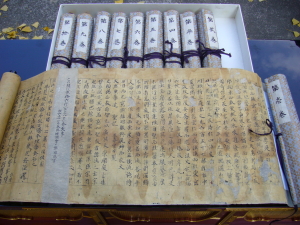 この大般若経は二龍山月曜院勧善寺に所蔵される全600巻に及ぶ大般若波羅密多経である。今も毎年夏祈禱の折、擅家の当家に於てその一部が読誦されている。