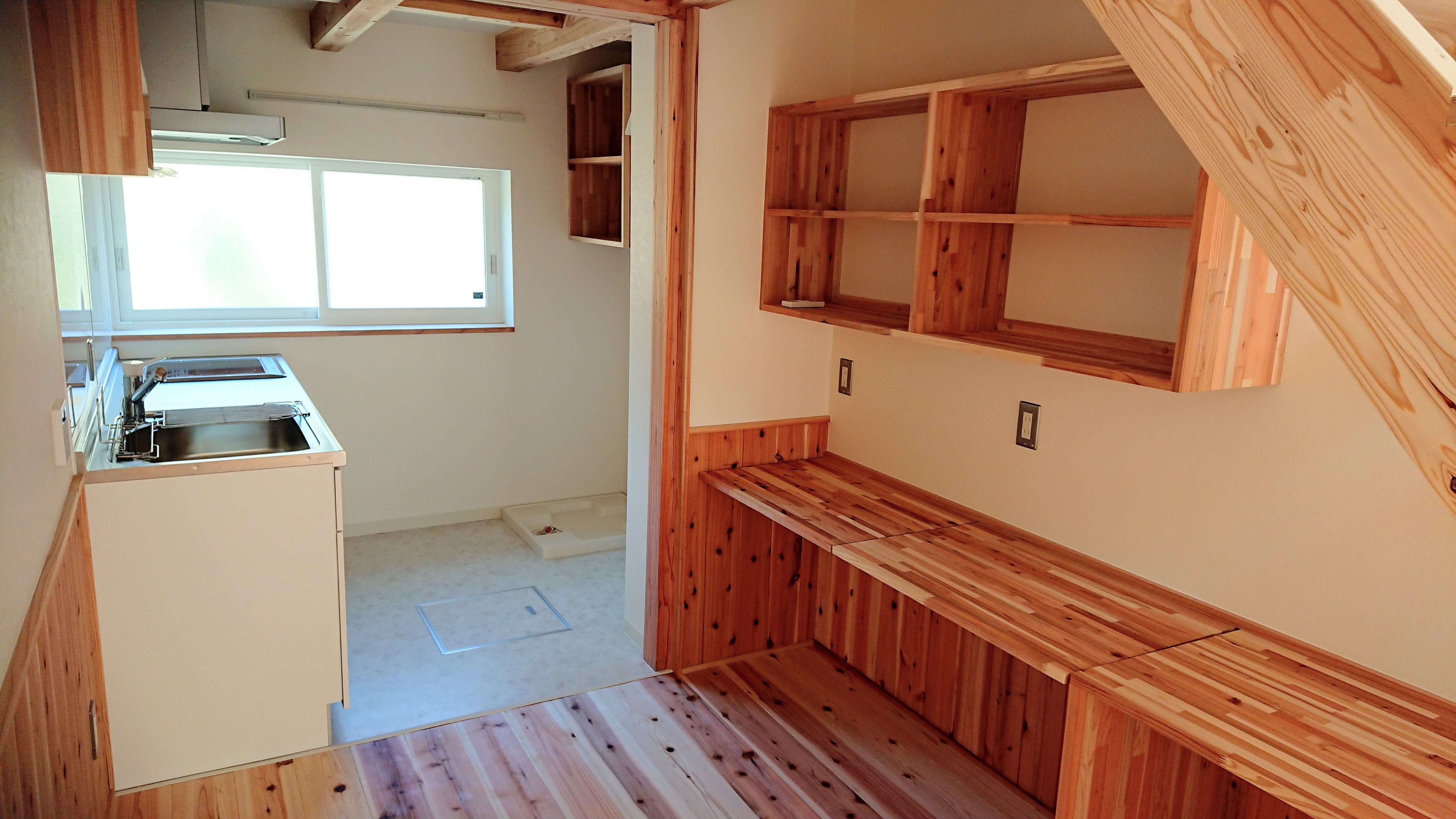 1階 部屋の奥がIHクッキングヒーター2口コンロのキッチンで洗濯機を置くスペースもあります。