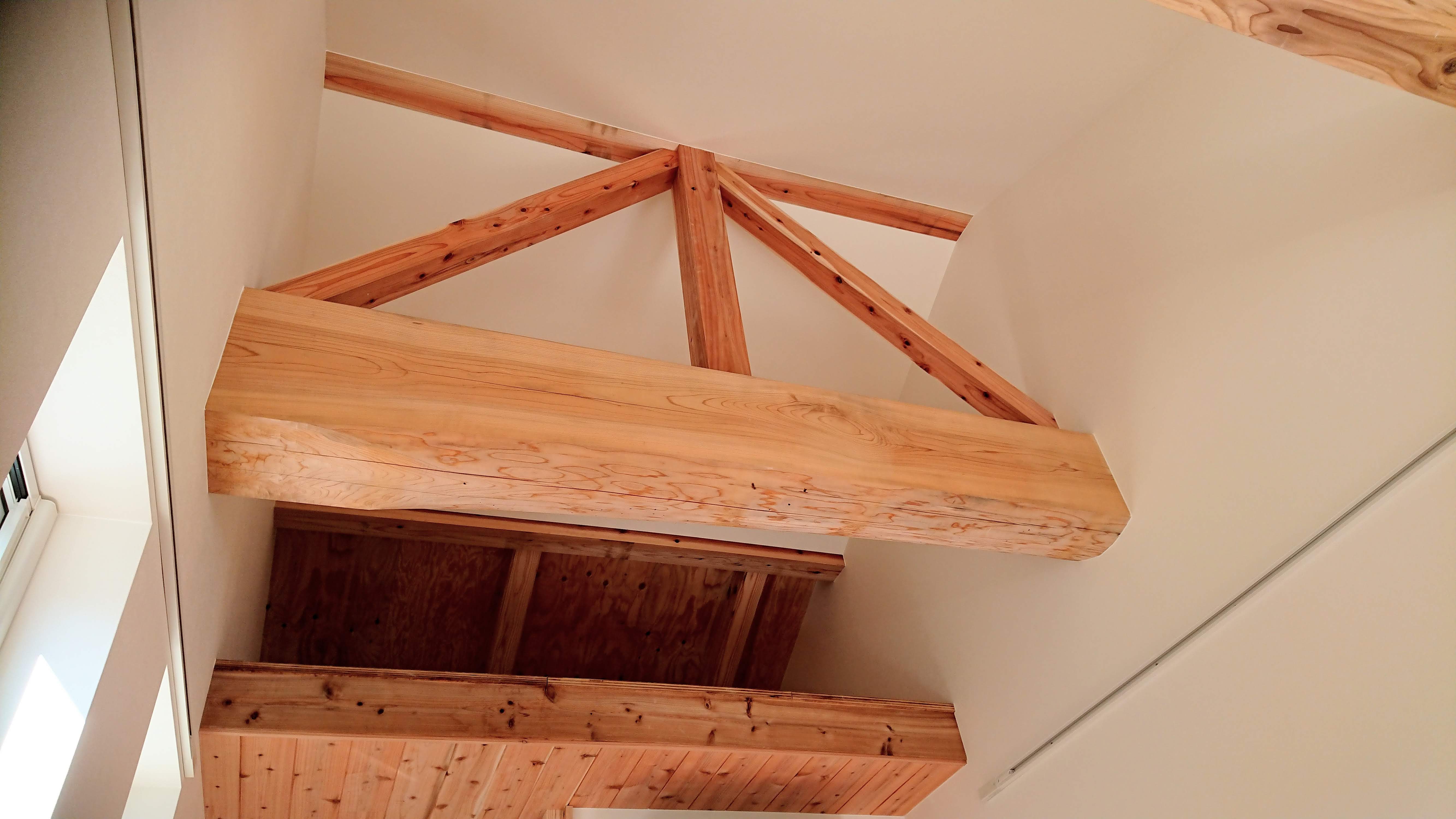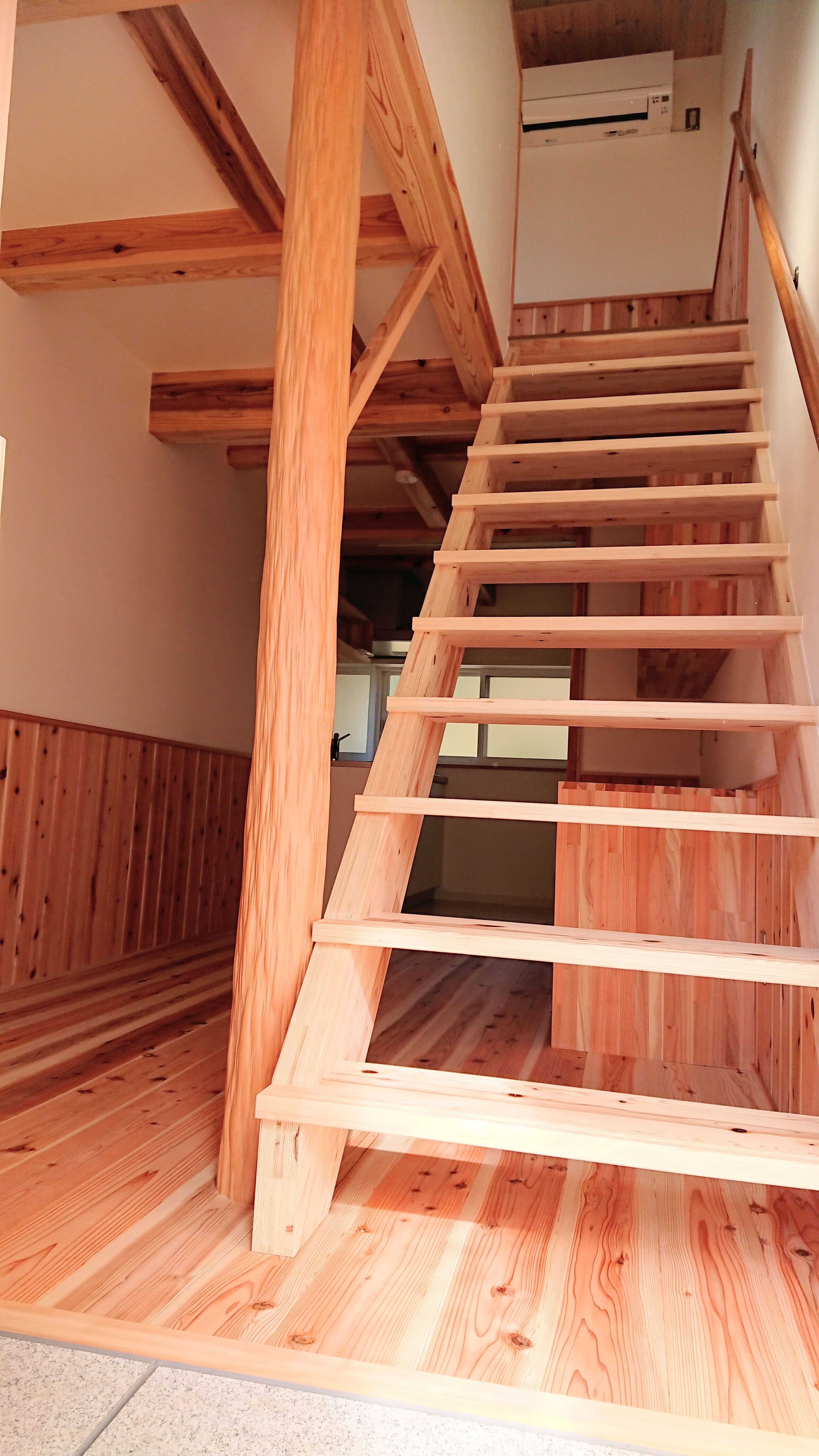 部屋は上下階に分かれています。階段横の柱は神山町で生産された天然絞り丸太を使用しています。